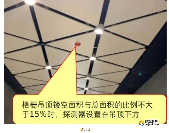 格栅吊顶处的感烟火灾探测器没有根据格栅镂空面积与总面积的比例情况进行设置。【图示1】【图示2】